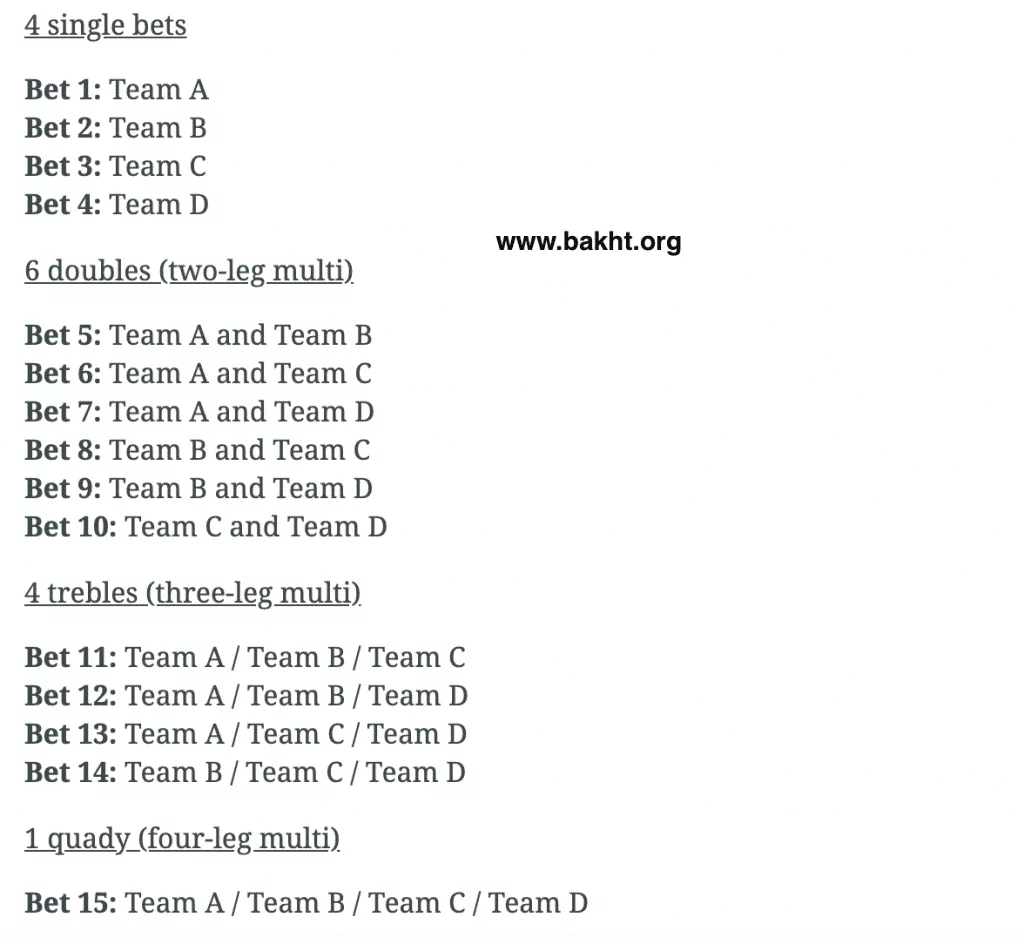 بعد از پیدا کردن چهار بازی مورد نظر، ۱۵ فرم شرط بندی باید بسازید و روی آنها ببندید. چهار شرط سینگل روی هر کدام از بازیها، شش میکس دابل، چهار میکس شامل سه بازی و در نهایت یک میکس شرط بندی که شامل تمام چهار بازی میشود.