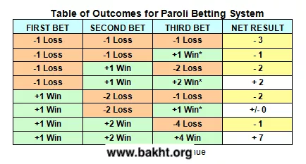 هدف سیستم شرط بندی پارولی، بدست آوردن سه برد پیاپی است. در ابتدا باید یک واحد شرط بندی را با توجه به سرمایه خود تعیین کنید. فرض کنید این عدد برای شما ده هزار تومان است. برای شروع یک واحد یا ده هزار تومان شرط بندی میکنید. اگر شرط شما باخت، این کار را ادامه میدهید. این کار تا حدی ادامه پیدا میکند تا در نهایت برنده شوید. بعد از برد، شرط خود را دو برابر میکنید. این مثال بیست هزار تومان شرط بندی میکنید. در صورتی که باختید، دوباره به شرط بندی روی ده هزار تومان برمیگردید. سیستم شرط بندی پارولی معمولا باید به از دست دادن یک واحد یا در نهایت برد هفت واحد ختم شود. اما ترکیب کردن سه شرط پیاپی، میتواند به نتایجی که در جدول بالا است ختم شود. به ازای هر سه شرط، هشت خروج میتوان داشت.