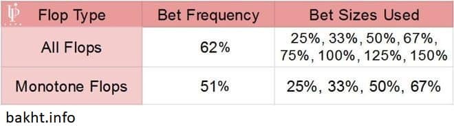ویدیوی الکس با مقایسه میانگین فراوانی شرط (Bet Frequency) و سایز شرط (Bet Sizes) در فلاپ های مونوتونیک و همه فلاپ ها شروع می کند. جدول زیر این مقایسه را خلاصه می کند: