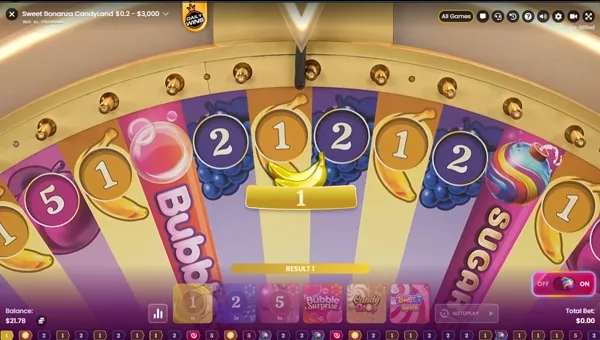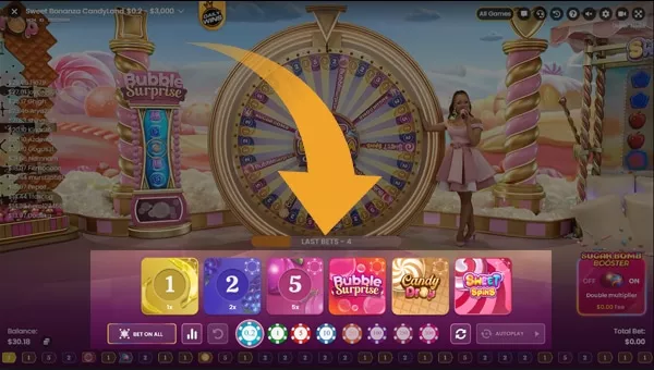 9 بخش بر روی چرخ وجود دارد که با بانس پر شده است. از این 9 بخش، 3تا بر روی این چرخ هستند کهSugar Bomb را فعال میکنند. از طرفی، 3تای آنها نیز برای Bubble Surprise هستند و 2تا برای Candy Drop و 1 بخش هم برای Sweet Spins.