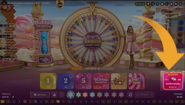 بازی بانس شوگر بمب، بصورت رندوم و تصادفی، یک ضرب کننده را بر روی تمامی موقعیتهای شرط بندی بر روی چرخ اِعمال میکند.