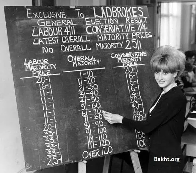 گزینههای شرط بندی نیز متنوعتر از تیم برنده شده بود. شرط بندی با لاین شرط بندی انجام میشد. عددی را به عنوان احتمال اصلی برای هر رویدادی در نظر میگرفتند. مردم باید بالا و پایین آن را شرط بندی میکردند. مثلا تعداد کرنرهای بازی دو تیم را به صورت بالای ده و پایین ده به شرط بندی میگذاشتند. هرچه میگذشت، موارد بیشتری برای شرط بندی وجود داشت. کار را حتی به شرط بندی روی سیاست کشاندند. تصویر زیر مربوط به دهه شصت میلادی است. مسئول بتینگ شاپ، ضرایب شرط بندی را جابجا میکند. اینجا هدف پیش بینی انتخابات است. اینکه کدام حزب (کارگر یا محافظهکار) اکثریت را به دست میآورد.