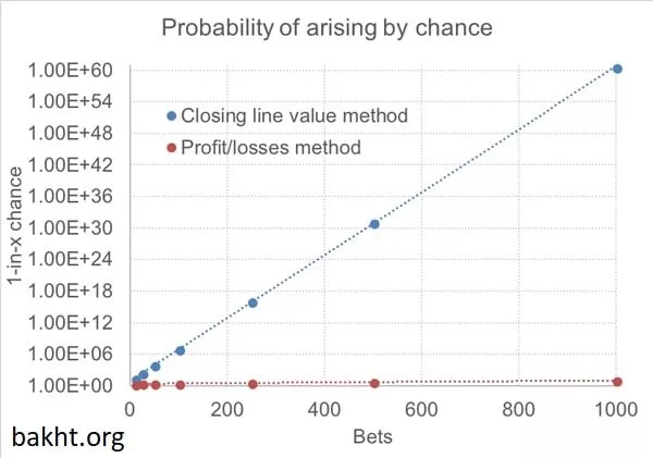نمودار پایین دو رویکرد برای ضرایب قمار 2.00 یک قمارباز را مقایسه می کند تا مشخص شود CLV چقدر می تواند اطلاعات معناداری در خصوص مهارت یک قمارباز، رو کند. محور Y لگاریتمی است و احتمال کسب دو درصد سود واقعی یا قابل انتظار را براساس متدهای CLV و سود/ضرر می سنجند.