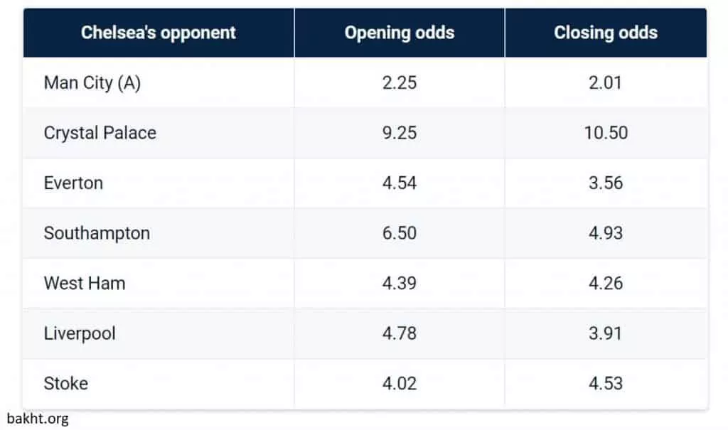 وقتی چلسی تحت هدایت مورینو در فصل 16-2015 روند بسیار بدی پشت سر می گذاشت، بررسی کردیم شرط بندی 10 یورو برای هر کدام از باخت های چلسی، چه پیامدی ممکن است داشته باشد. در تصویر زیر، ضرایب ابتدایی و نهایی چلسی را در 7 مسابقه آن فصل مشاهده می کنید. در آن دوران، بسیاری از شرط بندی ها علیه چلسی بود و ضرایب تغییرات قابل توجهی به خود می دید. ستون اول حریف چلسی، ستون دوم ضرایب اولیه و ستون سوم ضرایب نهایی را نشان می دهد:
