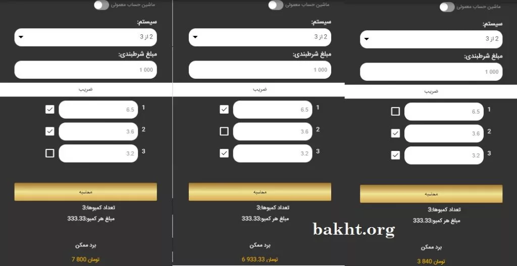 اگر یکی از موارد نگیرد، طبیعتا دو تا از کامبوها را از دست میدهید و ضریب پایینتر میآید. برای محاسبه شرط خود در آن شرایط باید سراغ ماشین حساب سایت شرط بندی بروید.