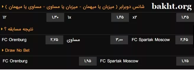 همانطور که مشاهده میکنید در حالت کلی، شانس برد تیم میزبان 2.75 است اما وقتی به صورت بدون مساوی شرط بندی میکنیم، این ضریب کاهش یافته و به 1.95 میرسد و در حالت برد و مساوی میزبان یعنی اورنبرگ (شانس دوبرابر یا 1X)، ضریب از آن هم پایینتر و روی 1.45 قرار گرفته است. اگرچه شرط بندی شانس دوبرابر عمدتا ضریب خیلی بالایی ندارد، اما ریسک در آن پایین است و برای میکس شرط بندی بسیار مناسب است.