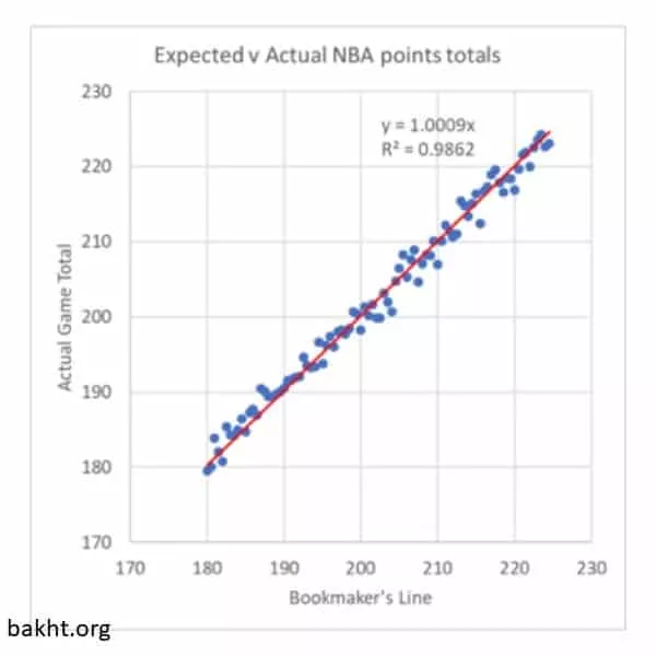 اینکه چقدر مدل های بوک میکرها می تواند خوب باشد را می توان در آخرین نمودار این مقاله مشاهده کرد. این نمودار ضرایب بوک میکرها را با نتایج واقعی مقایسه می کند. این نمودار براساس ضرایب نهایی و نتایج واقعی بیش از 15 هزار مسابقه NBA طی اکتبر 2007 تا مِی 2019، ترسیم شده است: